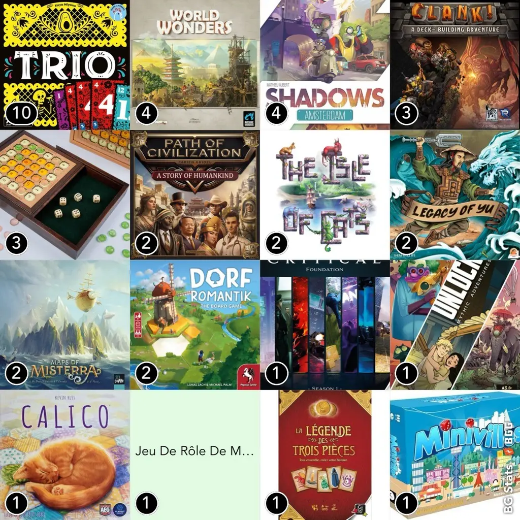 43 parties, 19 jeux, avec 9 joueurs différents #j2s